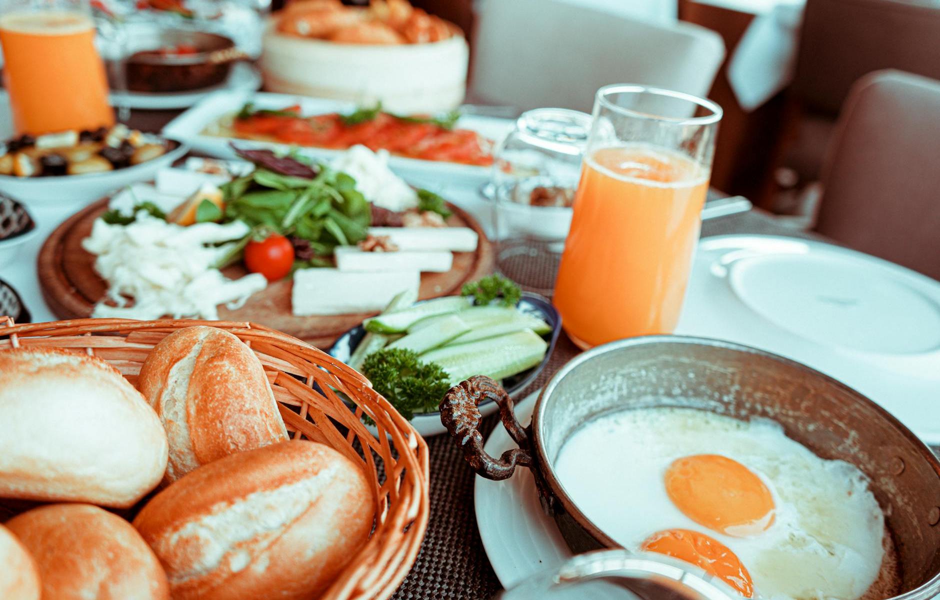 Breakfast: Wholemeal toast (carbohydrate); olives (fat); scrambled egg (protein); side serving of raspberries (fruit).